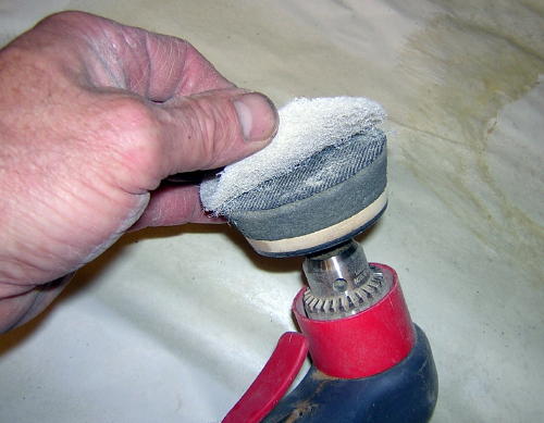 After stationary sanding to finest grit I go to ScotchBrite. On a round bowl this is easy with the bowl spinning, but on a natural edge bowl you have to rub some parts by hand. Then I tried sticking some to a hook and loop disc and found it a great improvement. The soft foam 3" dia disc sold by The Sanding Glove mounted on a high speed Sioux 45 deg. angle head drill makes a fine final polisher for any kind of bowl. I start with 3M grey-green fine #7448, then go to the gold very fine #7745, and end up with the white ultra fine #7445 than buffs. This sequence almost polishes the bowl at the end, and can be effectively used to buff out blemishes and scratches later on. It seems to blend the Behlen's Salad Bowl Finish right over the offending area. For more aggressive buffing at the start use the maroon 7447, but it leaves visible scratches.